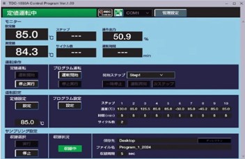PCと接続し専用ソフトウェアを用いることで、各種設定や運転操作、プログラム運転が可能となりました。通信機能を用いて冷却水循環装置のポンプ送水機能と連動させることで、温度サイクル試験を自動化します。設定温度や測定温度など各種情報のCSVファイルへの収録も可能です。
