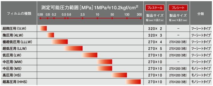 広い圧力領域(0.006~300MPa)をカバーするため、複数種のプレスケールを用意しました。