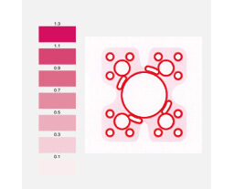 フィルム全体が圧力を測定するセンサーとなっており、圧力を受けた箇所、強さに応じて赤く発色します。発色の濃さから、面全体の圧力バランス、分布、大きさを一目で確認できます。