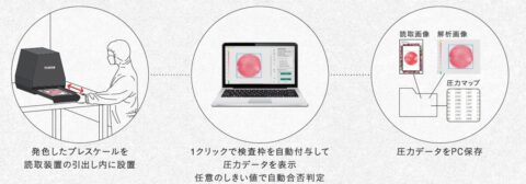 高解像度FAカメラ・LED内蔵の読取装置でプレスケールを読み取り、PC上で圧力データを検査・分析