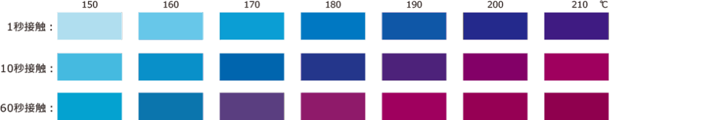 熱源に接触させたときの発色は熱源の温度と接触時間によって変わります。同じ温度でも短時間では発色が淡く青み方向であり、時間が長くなるにつれて発色が濃くまた赤み方向になります。ただし、発色は熱源と対向した部材の材質や熱特性、接触圧力、風の流れなどによっても変わるので、測定条件においての校正が必要です。