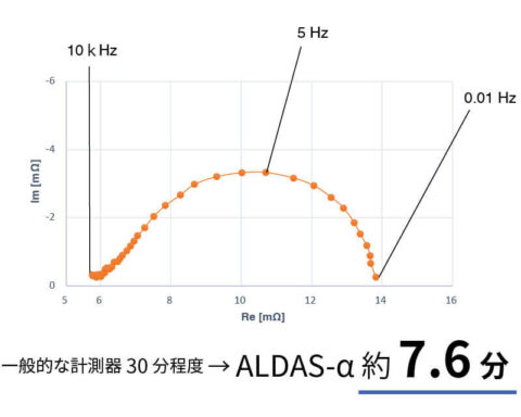 ALDAS-αは、高度なアナログ測定技術と特殊な電流センサー方式を採用しており、kHz帯域から1 Hz以下までの測定バラつきを抑制します。その結果、値のバラつきの少ないナイキストプロットを描き、測定後の解析を簡素化します。