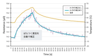 RM3546は、熱起電力や本器内部のオフセット電圧などを自動で補正し、測定誤差を限りなくゼロにするA-OVC機能を搭載しています。測定値のばらつきを抑え、分解能1 nΩの性能を最大限に引き出した測定ができます。