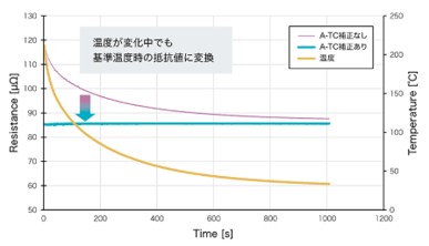 抵抗値と温度には相関関係があります。RM3546は、測定対象の温度と抵抗値を同時に計測し、基準温度での抵抗値にリアルタイムに補正するA-TC機能を搭載しています。
