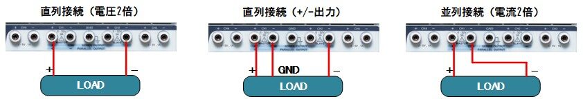 各チャンネルが絶縁されているためトラッキング機能を使用すれば、フロントパネルのスイッチで直列、並列、独立を選択し、CH1とCH2の出力端子を内部で切替え、直列トラッキングでは電圧加算または±トラッキング電源として、並列トラッキングでは電流加算が簡単にできます。