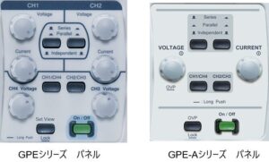 電圧・電流値設定ツマミをチャンネルごとのボリュームからエンコーダに変更することで操作の簡略化、設定値固定の強化をおこないました。また過電圧保護機能は定格電圧値固定から任意の電圧値で動作するように変更しています。そのほかの電気的仕様は変更ありません。