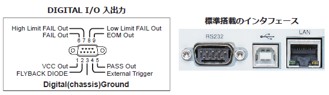 リモート制御⽤の通信インタフェース(RS-232C, USB, LAN)を標準で備えています。また、DIGITAL I/O 端⼦を使⽤することで外部トリガ信号での測定制御や、リミットテストでのPASS/FAIL 信号も出⼒することが可能です。
