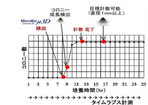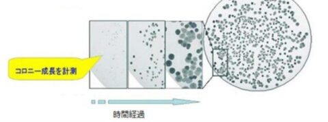 検査対象の寒天培地を培養しながら培地全体を顕微鏡レベルで連続タイムラプスモニタリングをし、微小コロニーを検出して自動的にコロニーカウントグラフを作成します。