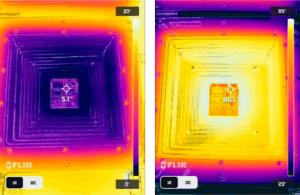 ※ 扉を開けた状態で基盤及び槽内のサーモグラフィを撮影(左:試験条件+5℃、無通電/右:試験条件+80℃、無通電)