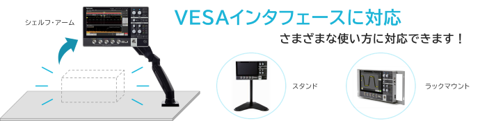 また、市販のVESAアクセサリやオプションのスタンドを使えばオシロスコープを浮かせて設置もできます。