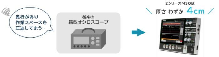 新しくオシロスコープが欲しいのですが作業するデスクが狭く、測定対象物以外にもPCやマルチメータなどを置いているのでスペースが限られていて、小型のオシロスコープでないと設置できないんです。