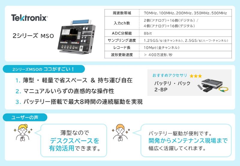 また、ユーザ・インタフェースはテクトロニクスの上位機種と共通のため、操作方法を学ぶ工数を大幅に削減でき、既存ユーザーもすぐに馴染める設計です。皆さまが抱える課題解決のヒントになれば幸いです。