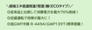 はい。こちらのECOタイプは、低GWP冷媒を使用しています。低GWP冷媒とは、地球温暖化係数(GWP)が低く、漏洩時の温暖化影響を抑えられる冷媒です。ESG経営の視点からも、省エネ性能や維持管理コストの低減など実務的なメリットが大きいです。補助金や自治体支援の後押しもあり、産業用機器分野での要求が高まっています。